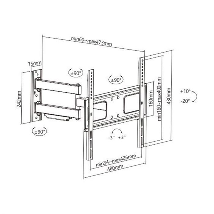 Metal Sheet Thickness : Bracket Arm THK=2mm cold-rolled sheet,VESA Panel THK=2mm cold-rolled sheet,Wall Plate THK=2.5mm cold-rolled sheet (Bracket Arm THK=0.079" cold-rolled sheet,VESA Panel THK=0.079" cold-rolled sheet,Wall Plate THK=0.098" cold-rolled sheet)