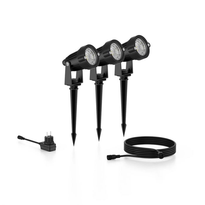 Features : \ A nice set of 3 ground spots from the Gardenlink system with which you can easily illuminate objects and walls. \ The head of the spot can be tilted and this allows you to direct the light downwards or upwards. \ The spot shines beautifully warm white light of 2700K. \ With this system you can easily connect various low-voltage fixtures and cables to each other to illuminate your entire garden. \ You can then easily add more lights or reposition them as you wish. Wiring is simple. \ and thanks to the low voltage, there is no risk of injury to you, your children, or your pets. \ IP44, This rating ensures that these devices can withstand the elements and operate safely in potentially wet environments.